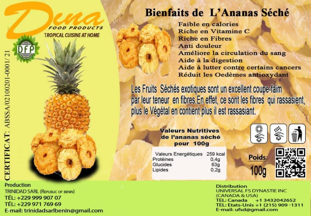 Notre ananas séché est préparé à partir de tranches d’ananas mûres et juteuses, séchées pour conserver leur saveur naturelle et leur douceur. Riche en fibres alimentaires, en vitamines et en minéraux, notre ananas séché offre une collation délicieuse et nutritive. Son goût sucré et acidulé en fait une option de choix pour satisfaire les envies de sucreries tout en bénéficiant des bienfaits nutritionnels. Parfait pour une utilisation comme en-cas sain ou pour ajouter une touche de saveur tropicale à vos plats préférés, notre ananas séché est une option délicieuse et polyvalente.